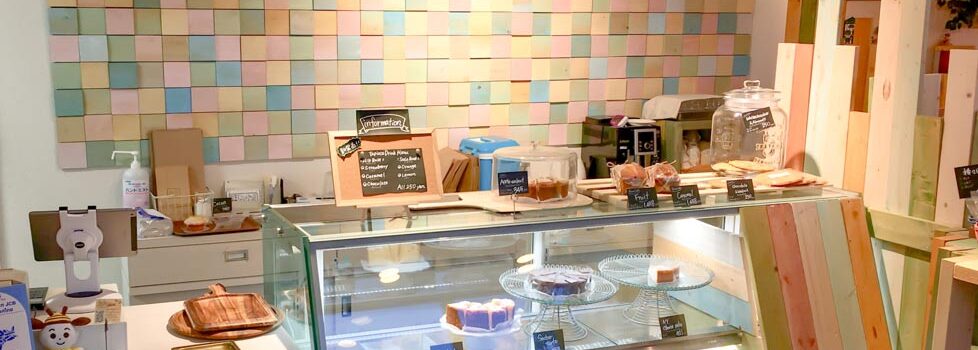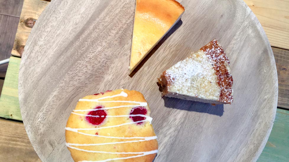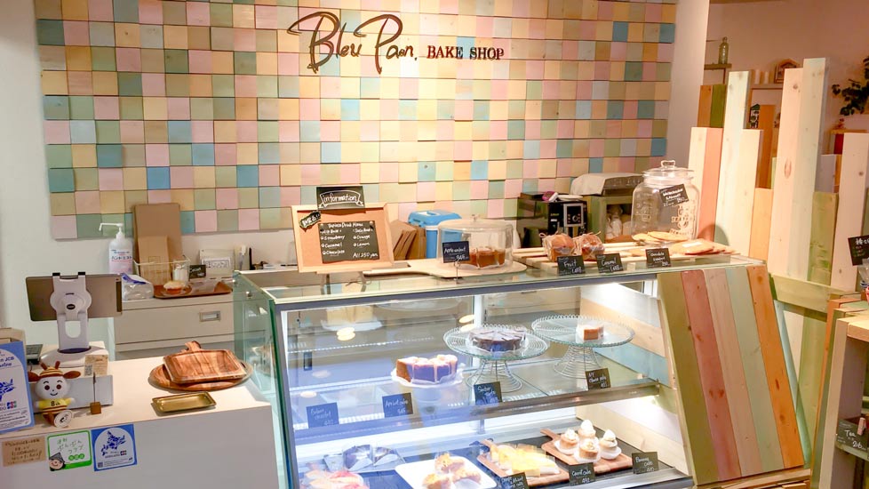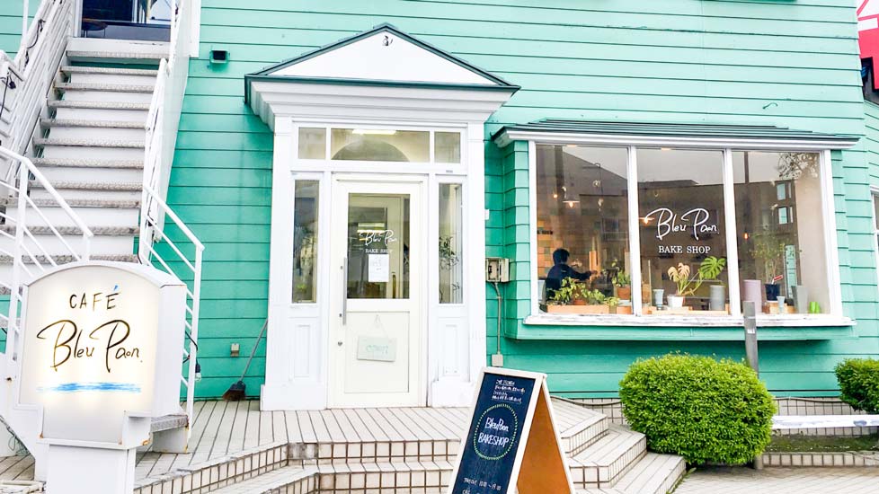 ライトグリーのおしゃれな外観が目印の「ブルーパンベイクショップ」は、マフィンやケーキなどの焼き菓子をメインに食べられるベイクショップ。