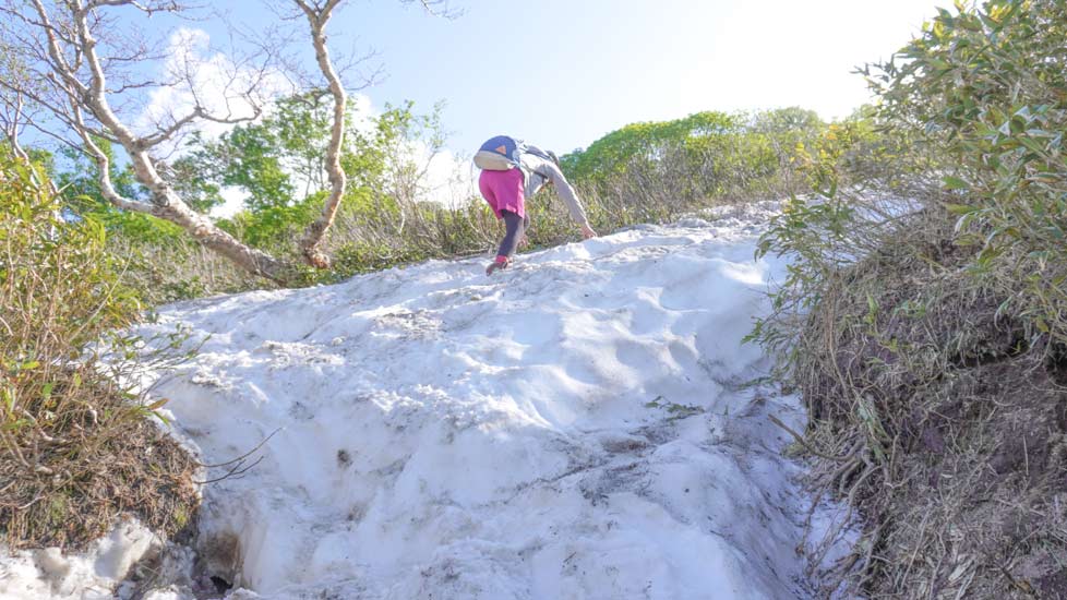 途中、まだ雪が多く残る場所もあり、登山道は雪解け水でぬかるんでいます。慎重に足場を確認しないと危ないですね。