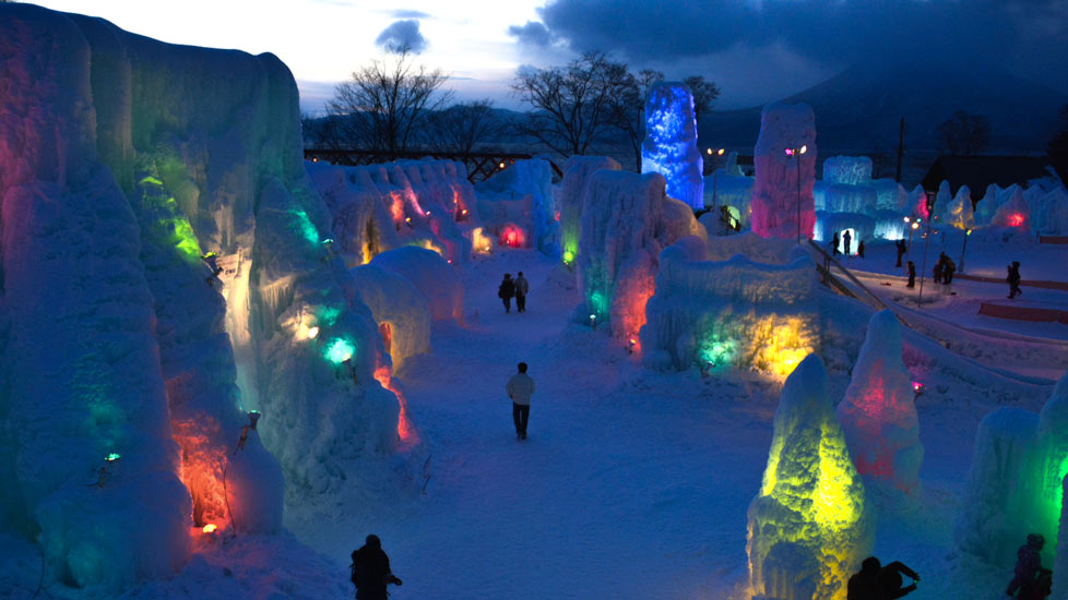 支笏湖畔の温泉街では毎年1月下旬から「千歳・支笏湖 氷濤まつり」が開催されます。支笏湖の湖水をスプリンクラーで吹き付け凍らせた氷のオブジェが色とりどりにライトアップされ、幻想的な雰囲気に包まれます。期間中は様々なイベントも開催されており、期間中の土・日18:30からは花火も打ち上げられます。