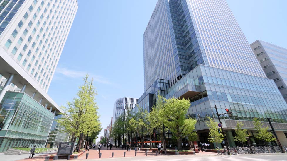 近代的な商業ビルとおしゃれなカフェテラス。北海道開拓の面影を残す広場は新旧が調和する空間。