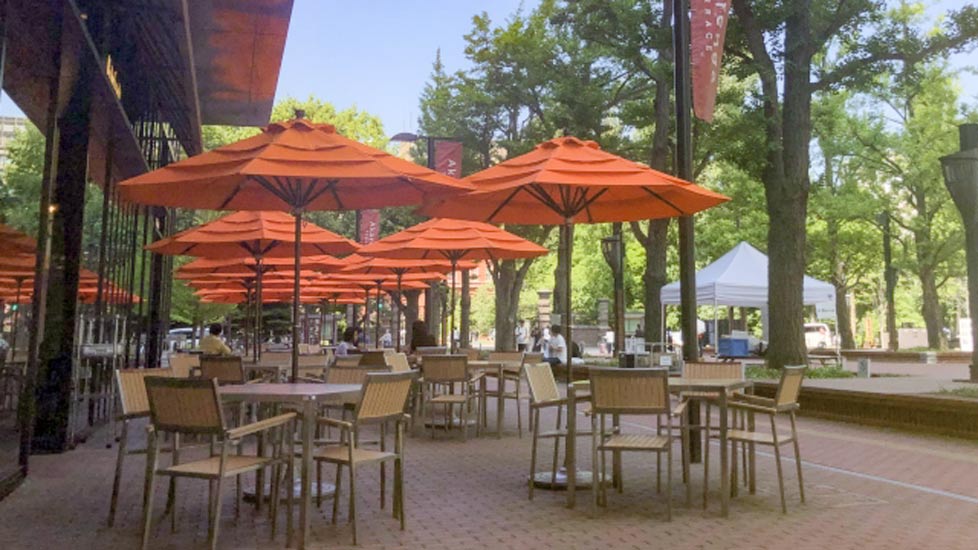 春の芽吹く季節から緑深まる夏、広場のベンチにはイチョウの木でできる影で腰を下ろし、本を読んだりおしゃべりを楽しむ人々の姿を多く目にします。秋の色づく季節には、黄色に染まるイチョウ並木に思わず目を奪われます。葉が落ち、雪が降る季節にはイルミネーションが美しいイチョウ並木は四季を通じて親しまれています。