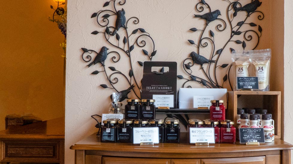 お店のこだわりはスイーツ以外にも。 特製ジャムやキャラメル、お菓子づくりに最適なメイプルロップやシュガーなども販売している。