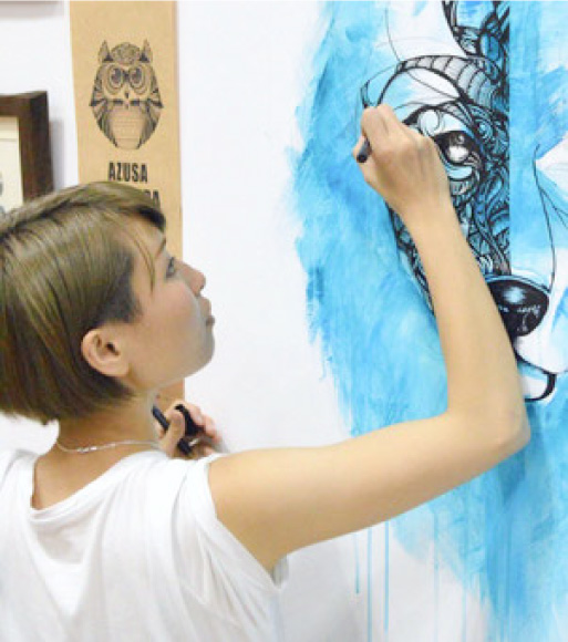 カラーインク、ペン、筆を使い、近年は動物を中心に制作